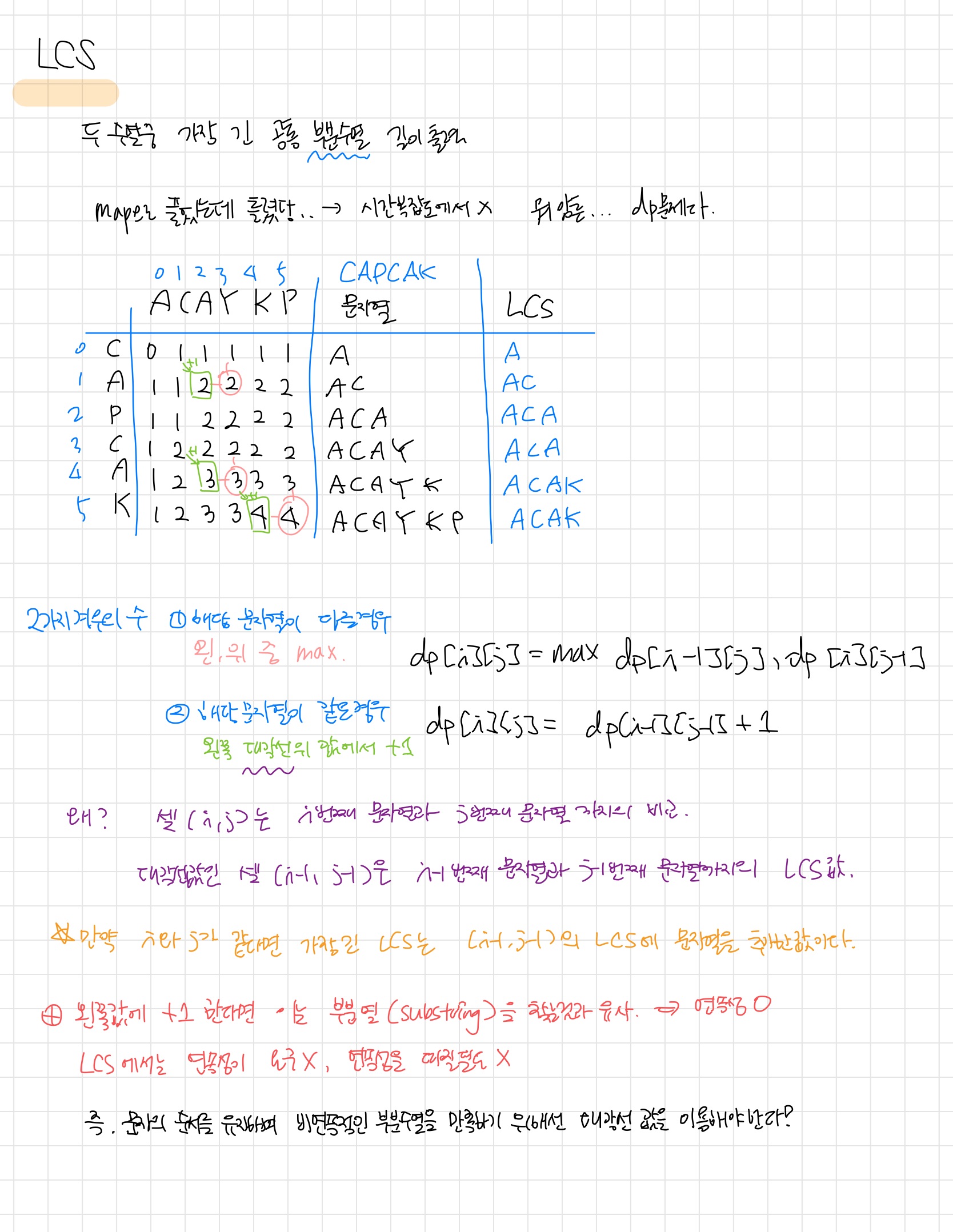 대표적인 dp문제이다. 하지만, 나는.. 바보같이 처음에 map써봤다가 당차게 틀려먹었다.. (대체 왜이러니..) map쓰면 문자열을 계속 순회해야해서 시간복잡도에서 걸린다. 그리고 이건 대표적인 dp라서 그냥 내가 바보였던것으로.. 넘어갑시다. 아무튼, dp를 이용해서 각 부분 문자열에 대한 LCS 값을 구해나가면 된다! 여기서 dp의 경우의 수는 두가지인데, i번째 문자열 == j번째 문자열 이건 왼쪽 위 대각선 값에 +1 해주면된다. 왼쪽 위 대각선 값이 이전 문자열인 (i-1,j-1)의 LCS 값이기 때문! i번째 문자열 != j번째 문자열 이건 왼쪽과 위 중 max값을 가져가면 된다. #include #include using namespace std; int main(void) { ios::s..